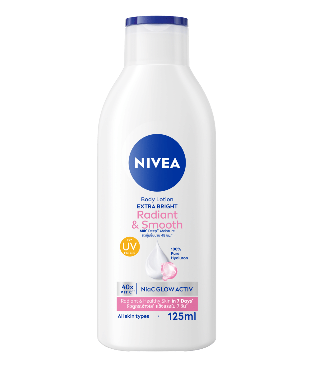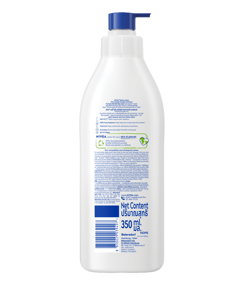นีเวีย บอดี้ โลชั่น เอ็กซ์ตร้า ไบรท์ ดับเบิ้ล มอยส์เจอร์ ผลิตภัณฑ์บำรุงผิวกาย ไนอาซี โกลว์ แอกทีฟ ผสาน 2 พลังแอ็กทีฟไบรท์เทนนิ่ง ไนอาซีนาไมด์ + วิตามินซี ฟื้นบำรุงผิวลึก++ เสริมปราการผิวแข็งแรง ผิวดูกระจ่างใสสุขภาพดีใน 7 วัน* วิตามินอี ฟื้นบำรุงผิวชุ่มชื้นยาวนาน สุขภาพดี เติมและกักเก็บความชุ่มชื้น