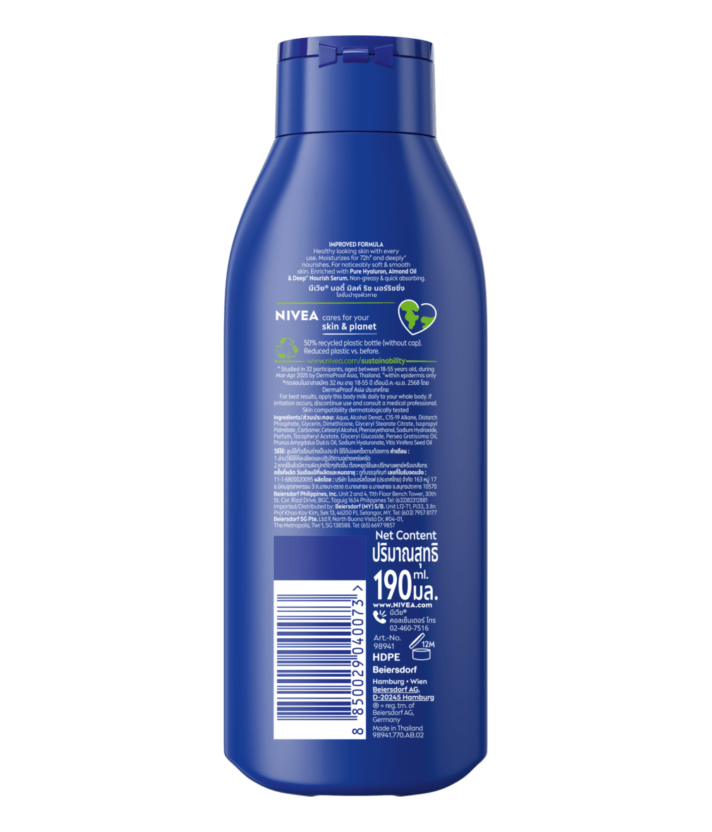นีเวีย บอดี้ มิลค์ ริช นอร์ริชชิ่ง โลชั่นบำรุงผิวกาย ผิวเนียนนุ่มชุ่มชื้นสุขภาพดีขั้นทุกครั้งที่ใช้ ผสานพลังของไฮยาลูรอน น้ำมันเมล็ดอัลมอนด์ และวิตามินอี เนื้อสัมผัสบางเบาซึมไว บำรุงลึก+ให้ผิวเนียนนุ่ม ชุ่มชื้นยาวนาน 72 ชั่วโมง*