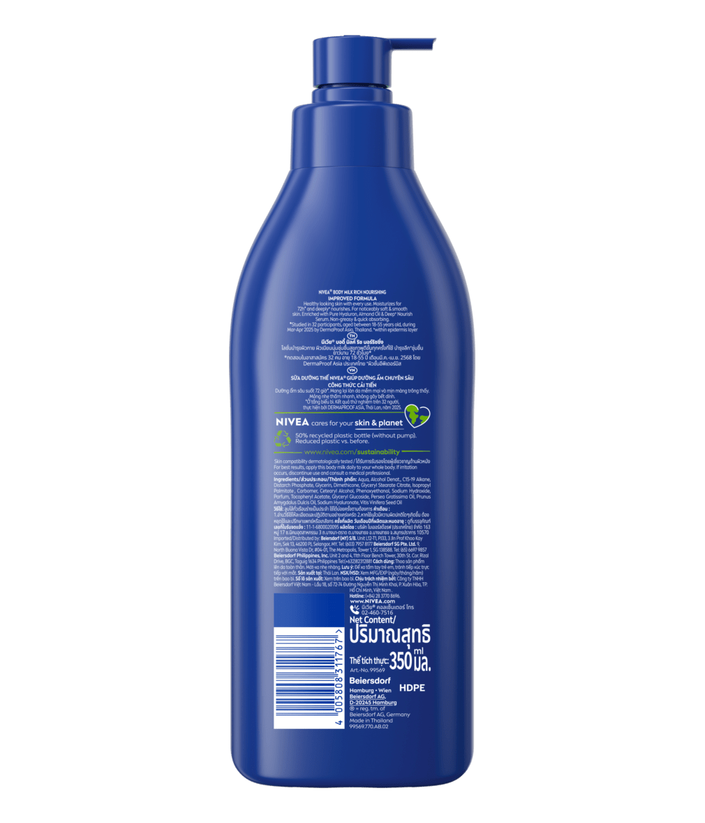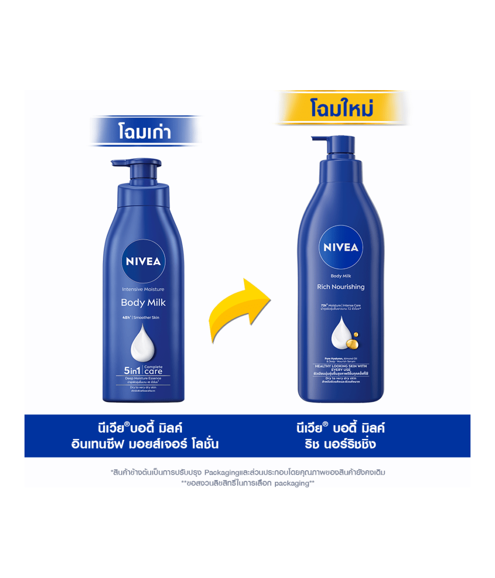 นีเวีย บอดี้ มิลค์ ริช นอร์ริชชิ่ง โลชั่นบำรุงผิวกาย ผิวเนียนนุ่มชุ่มชื้นสุขภาพดีขั้นทุกครั้งที่ใช้ ผสานพลังของไฮยาลูรอน น้ำมันเมล็ดอัลมอนด์ และวิตามินอี เนื้อสัมผัสบางเบาซึมไว บำรุงลึก+ให้ผิวเนียนนุ่ม ชุ่มชื้นยาวนาน 72 ชั่วโมง*