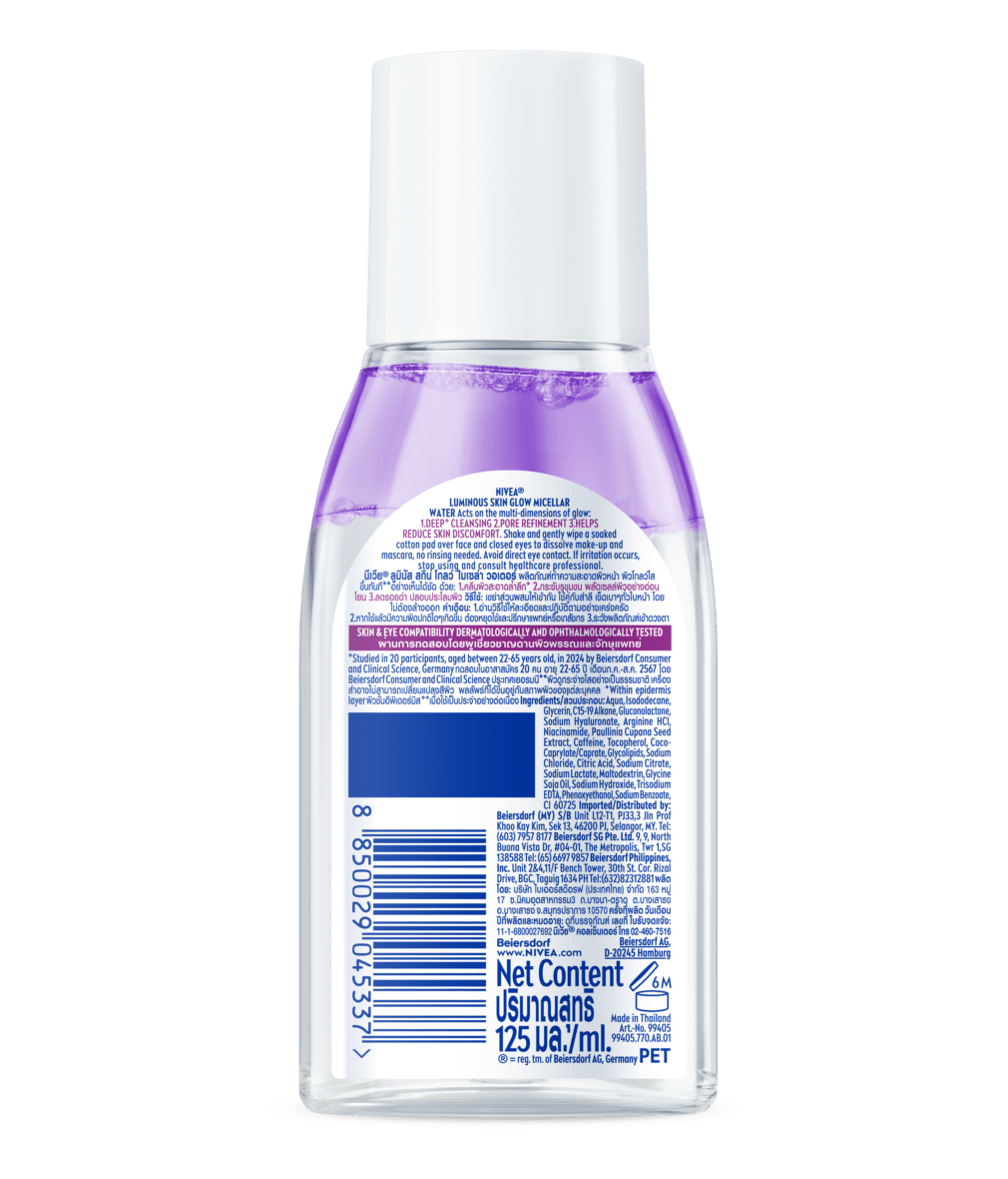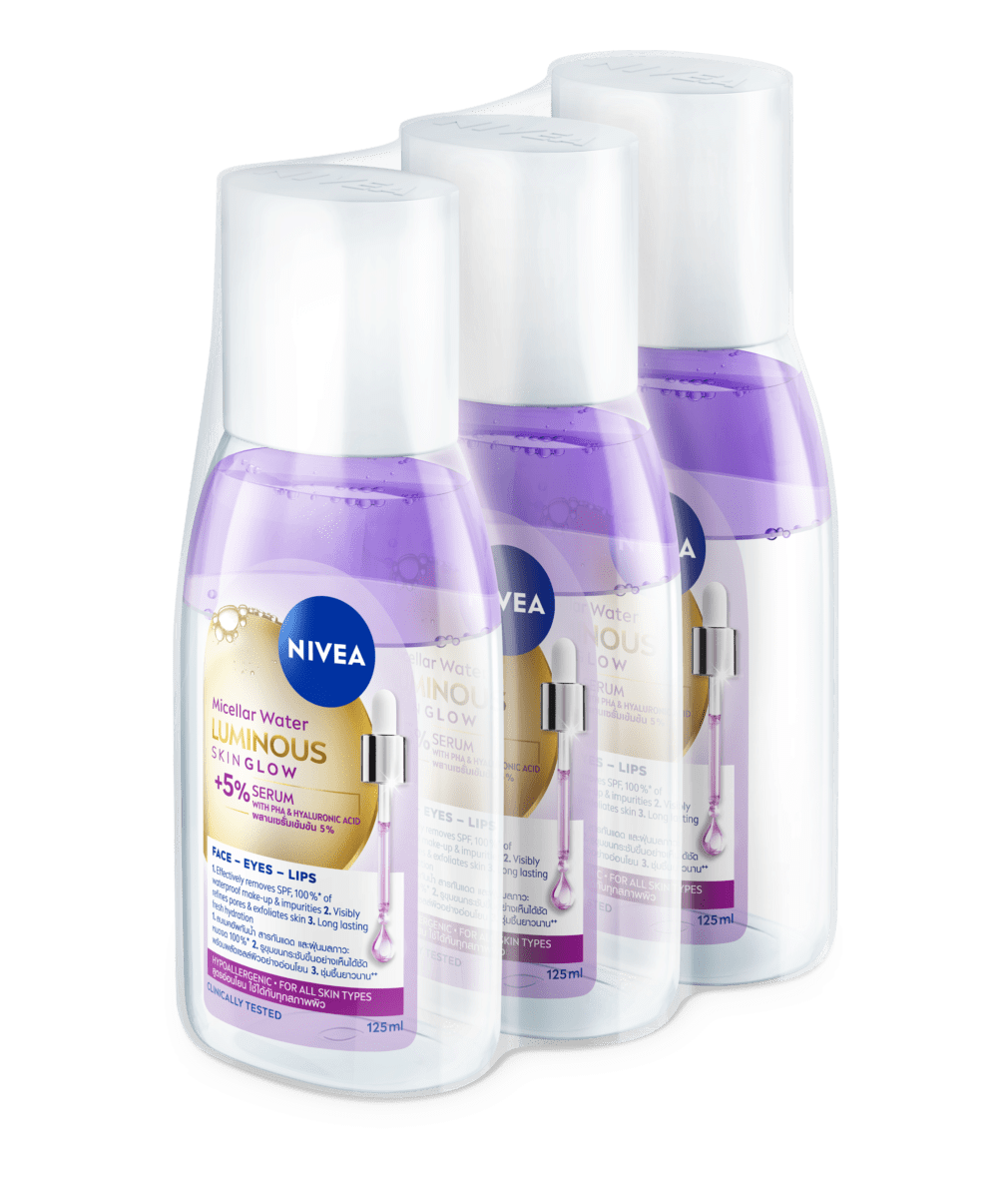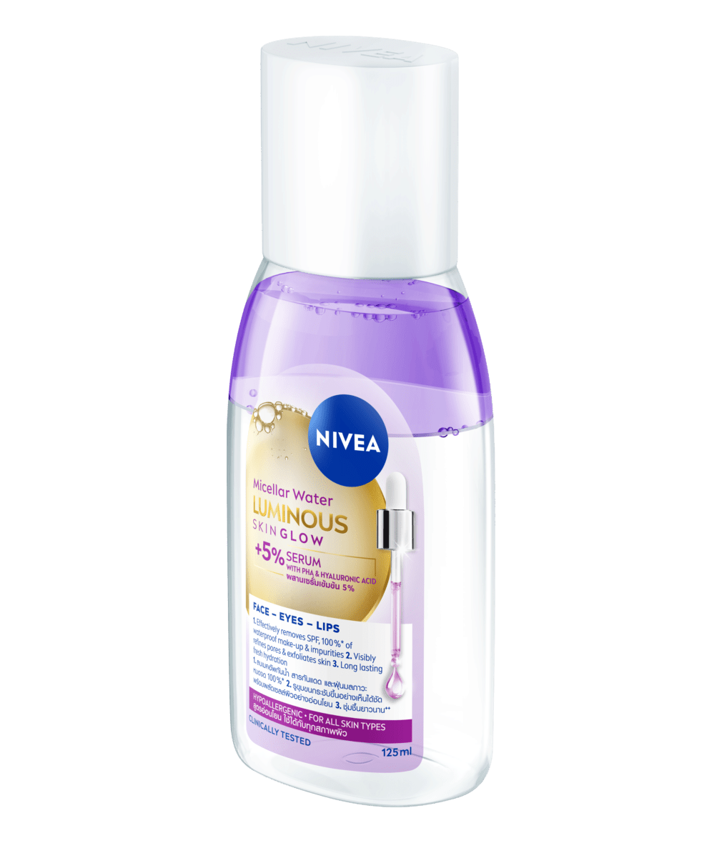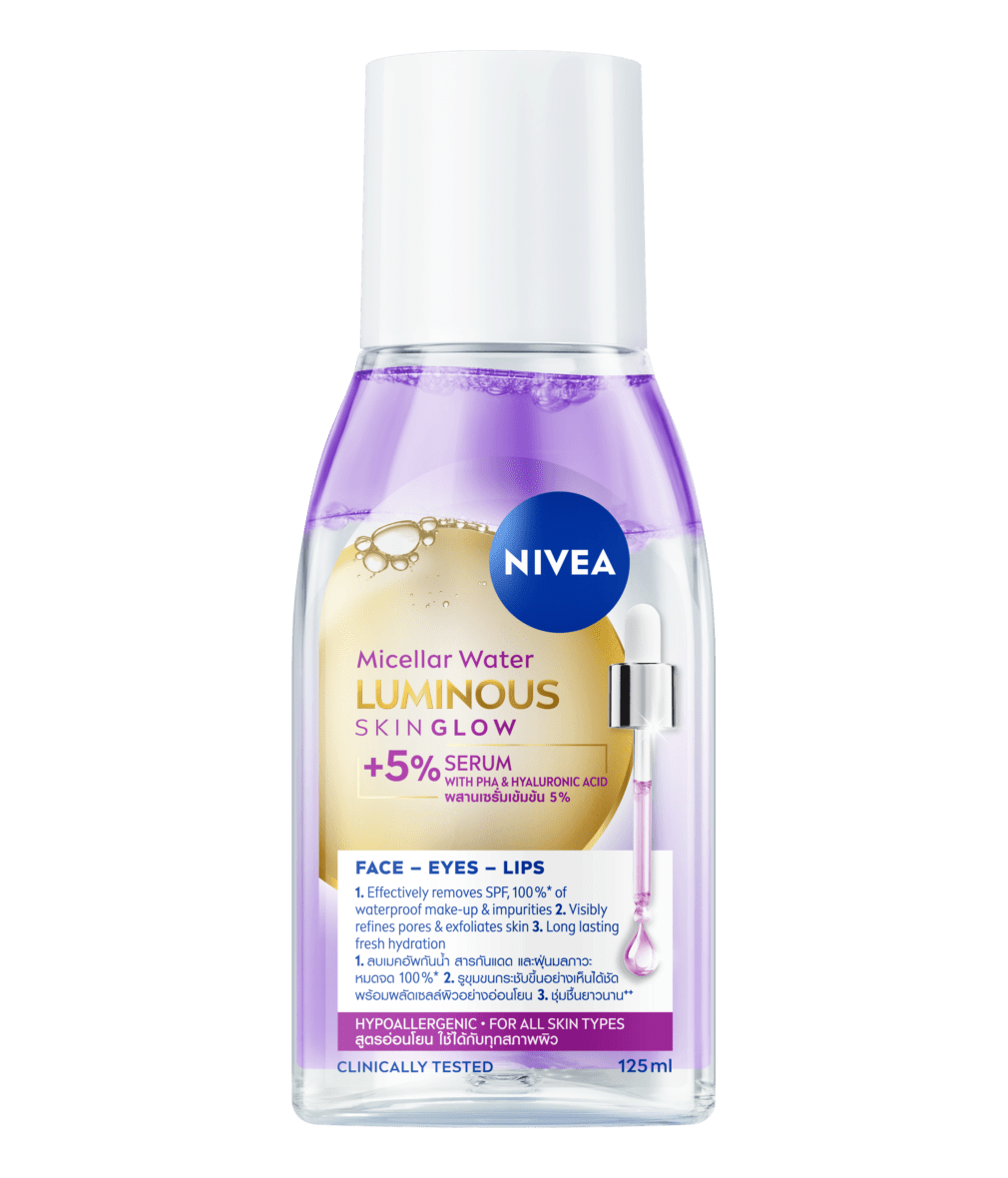 นีเวีย ลูมินัส สกิน โกลว์ ไมเซล่า วอเตอร์ ผลิตภัณฑ์ผสานเซรั่มเข้มข้น 5% ที่มี PHA และไฮยาลูรอน เพื่อผิวโกลว์ใส** 3 มิติ: 1. ลบเมคอัพกันน้ำ สารกันแดด และฝุ่นมลภาวะ หมดจด 100%* 2. รูขุมขนกระชับขึ้นอย่างเห็นได้ชัด พร้อมผลัดเซลล์ผิวอย่างอ่อนโยน 3. ชุ่มชื้นยาวนาน++ สูตรอ่อนโยน ใช้ได้กับทุกสภาพผิว