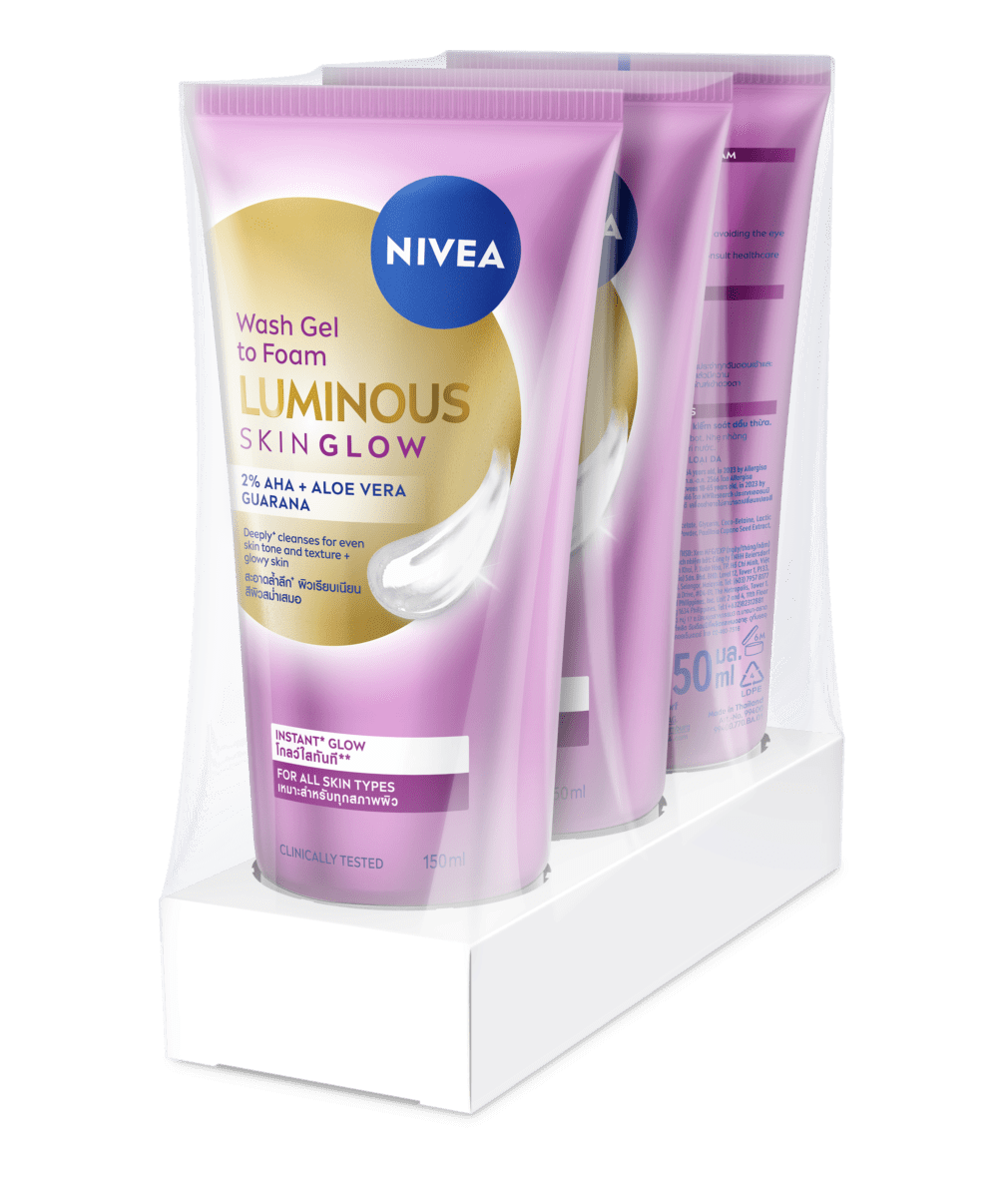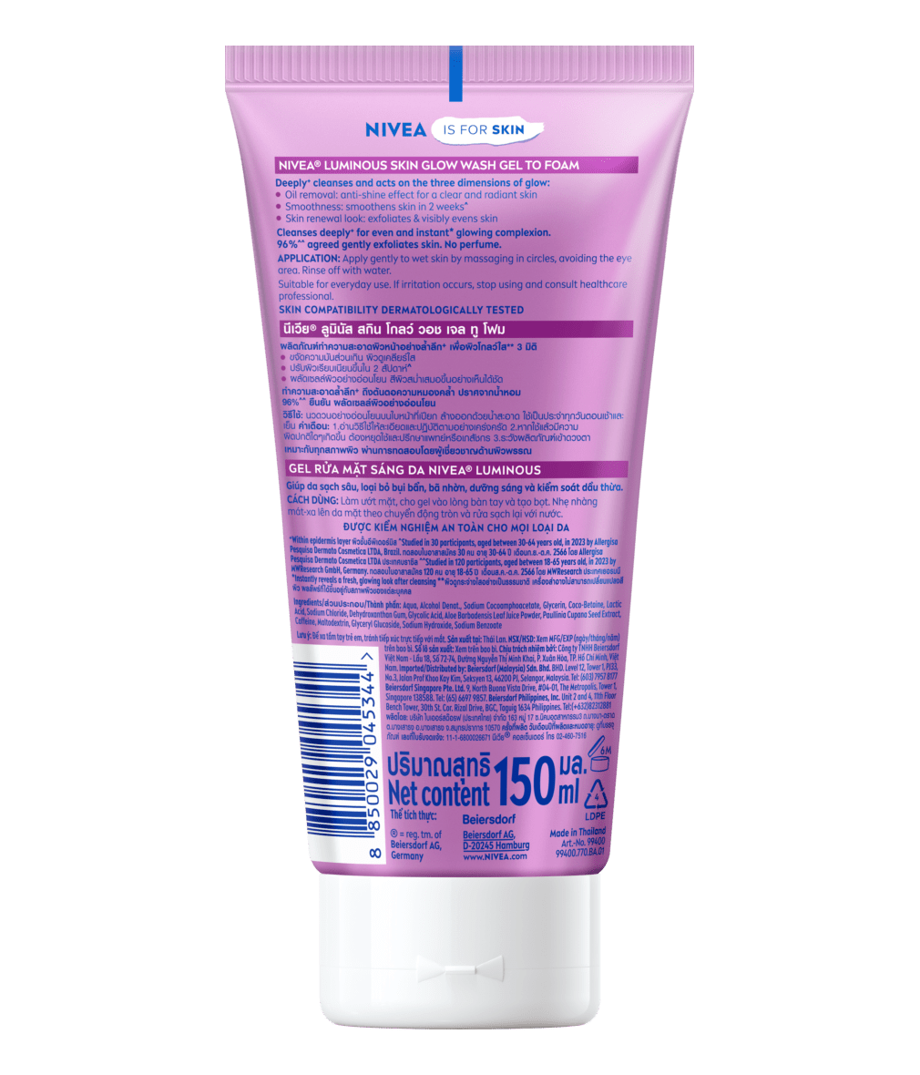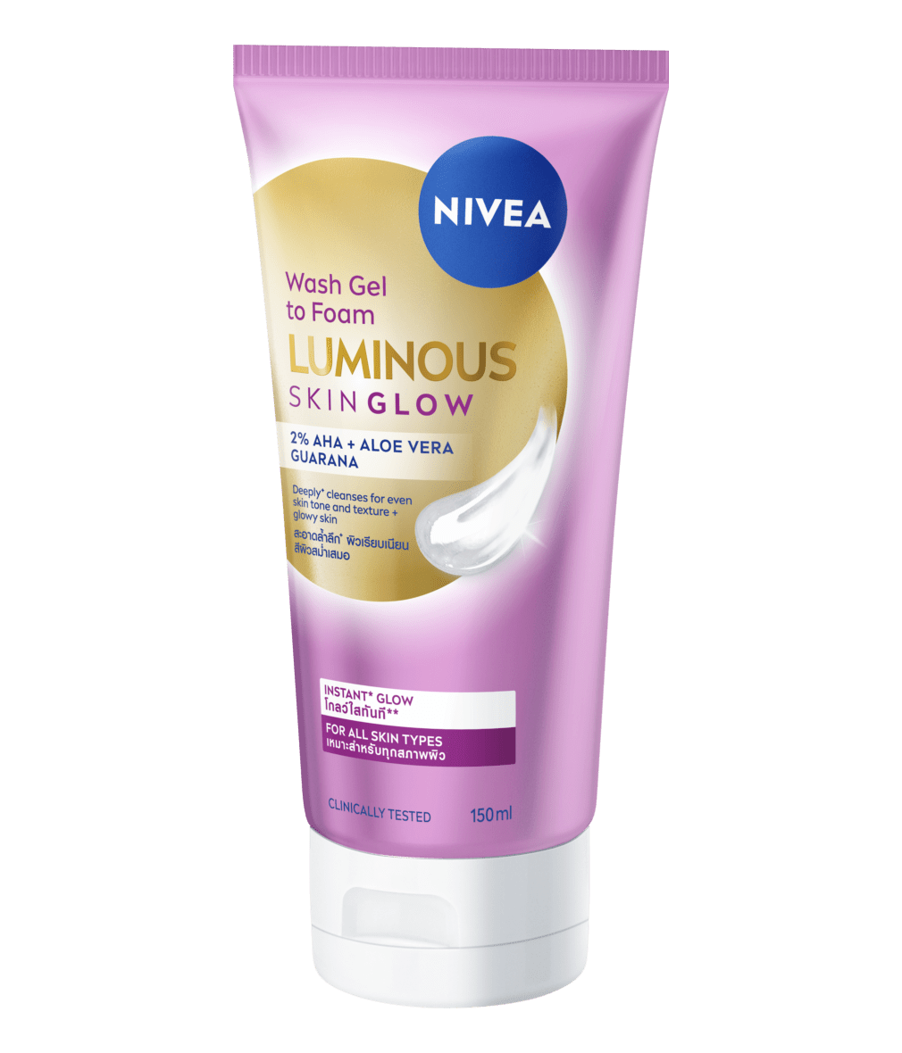 นีเวีย ลูมินัส สกิน โกลว์ วอช เจล ทู โฟม ผลิตภัณฑ์ทำความสะอาดผิวหน้าอย่างล้ำลึก+ เพื่อผิวโกลว์ใส** 3 มิติ -ขจัดความมันส่วนเกิน ผิวดูเคลียร์ใส -ปรับผิวเรียบเนียนขึ้นใน 2 สัปดาห์^ -ผลัดเซลล์ผิวอย่างอ่อนโยน สีผิวสม่ำเสมอขึ้นอย่างเห็นได้ชัด ทำความสะอาดล้ำลึก+ถึงต้นตอความหมองคล้ำ ปราศจากน้ำหอม