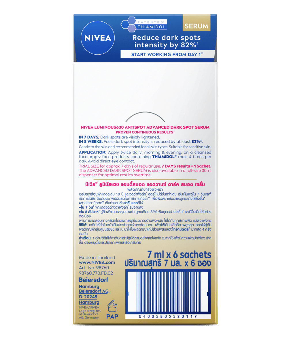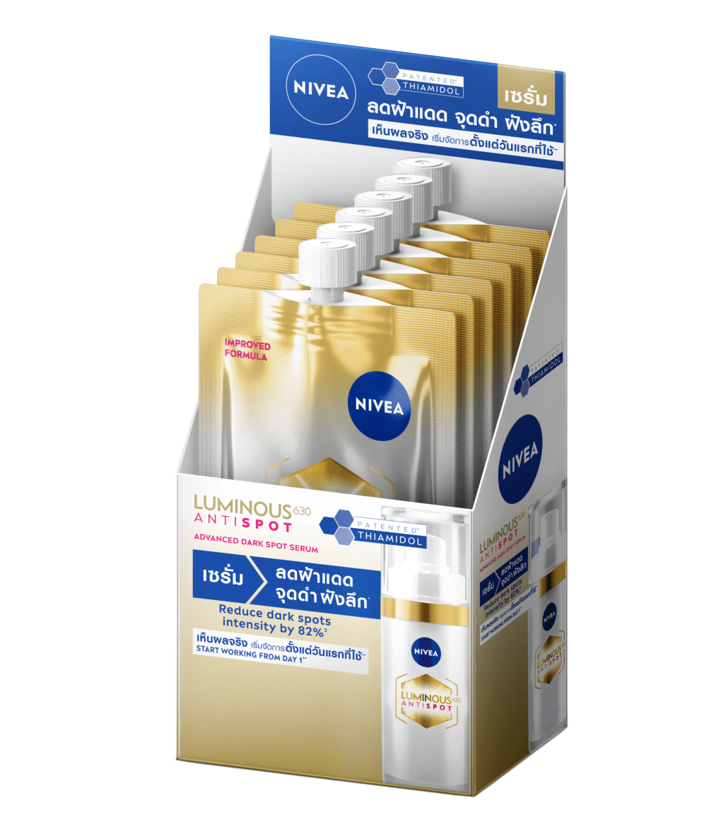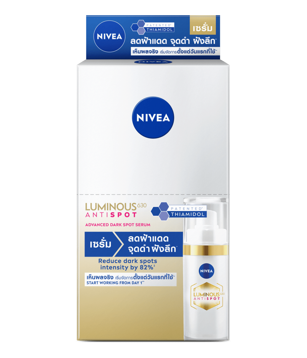 นีเวีย ลูมินัส630 แอนตี้สปอต แอดวานซ์ ดาร์ค สปอต เซรั่ม ลดเลือนฝ้าแดดสะสม 10ปี และจุดดำฝังลึก* เริ่มเห็นผลใน 7 วันแรก2 จัดการได้ลึก* ถึงต้นตอ ลดโอกาสการเกิดซ้ำ++ เพื่อผิวสม่ำเสมอและดูกระจ่างใส+ ขึ้นถึง 2 เท่า2 เนื้อสัมผัสบางเบา ผสานไฮยาลูรอนิค แอซิด เติมความชุ่มชื้นให้ผิว เพื่อผิวกระจ่างใส+ ยิ่งขึ้น
