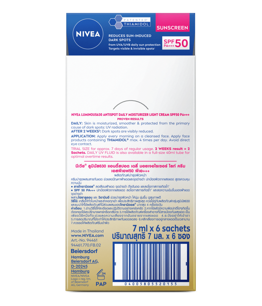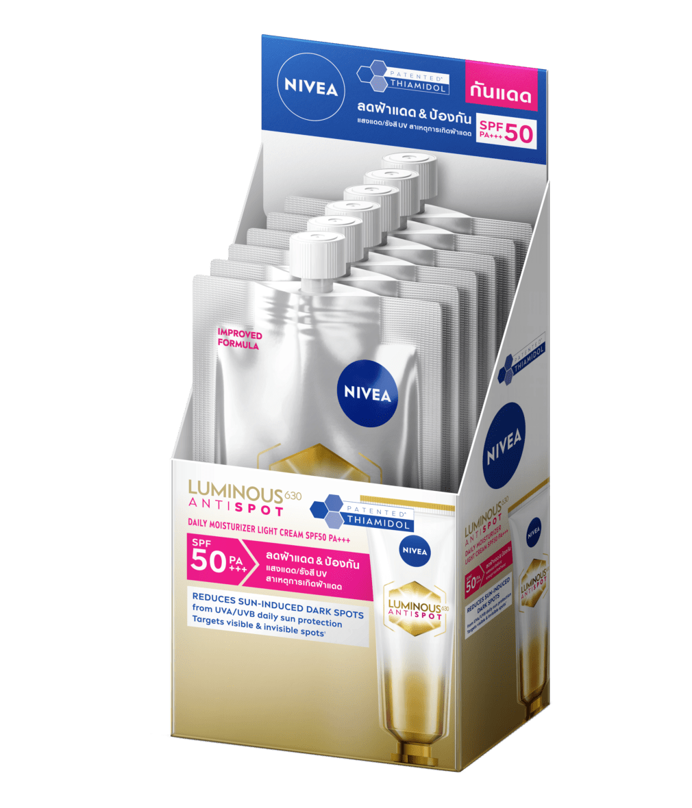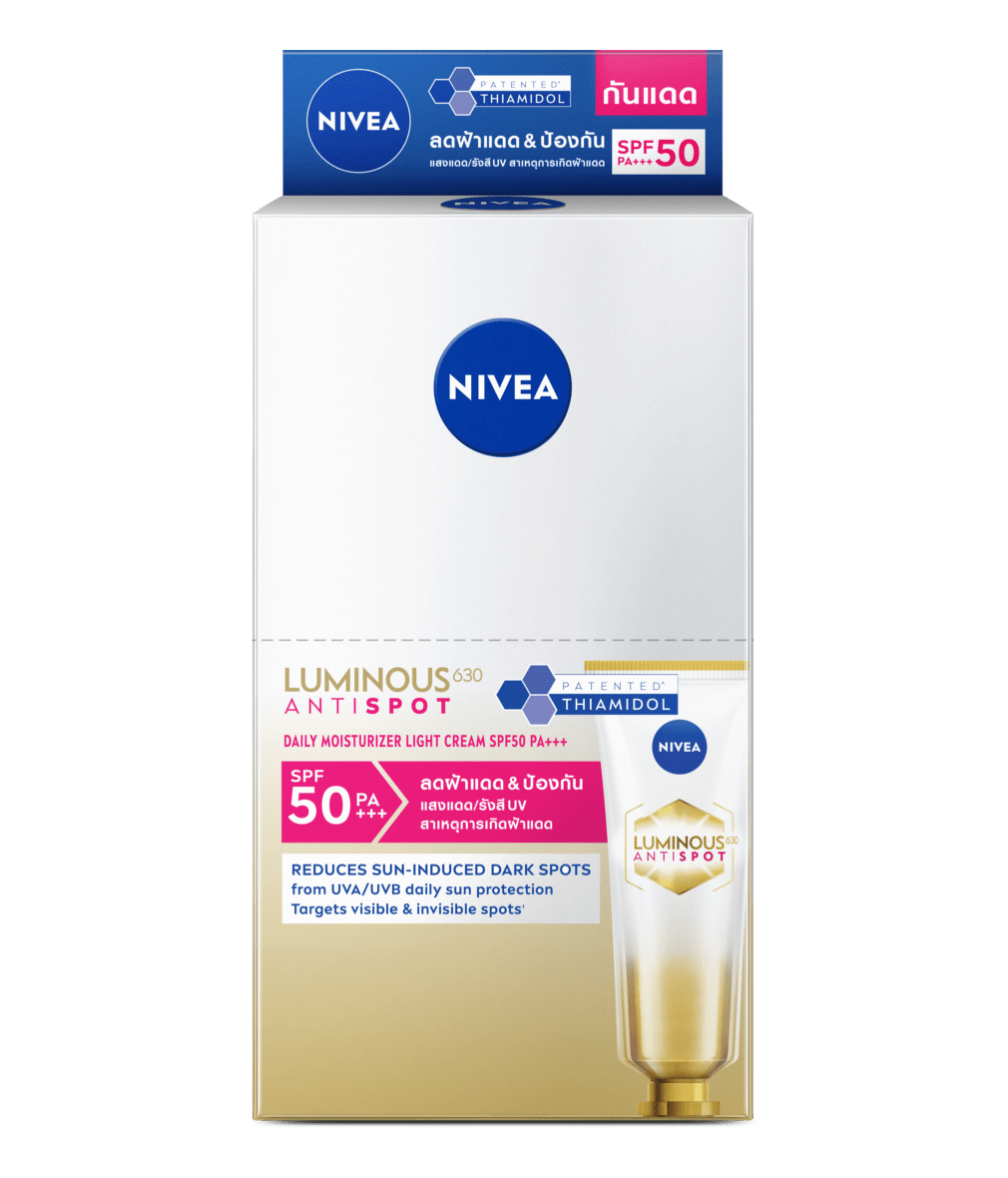 นีเวีย ลูมินัส630 แอนตี้สปอต เดลี่ มอยเจอไรเซอร์ ไลท์ ครีม เอสพีเอฟ50 พีเอ+++ ครีมบำรุงผสมสารกันแดด มีสารป้องกันแสงแดด SPF 50 สูตรควบคุมความมัน มีส่วนผสมของสารไทอามิดอล® SPF 50 PA+++ ไฮยาลูรอนและวิตามินอี ป้องกันแสงแดด พร้อมลดเลือนฝ้าแดดสะสม10ปี จุดดำฝังลึก* ใน 2 สัปดาห์2 และลดการเกิดซ้ำ+