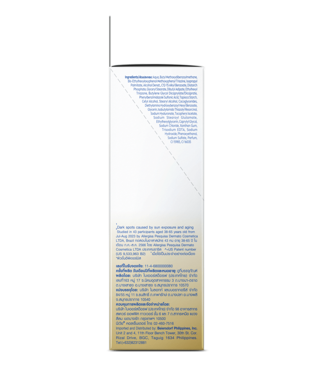 ประกอบด้วย Aqua, Butyl Methoxydibenzoylmethane, Bis-Ethylhexyloxyphenol Methoxyphenyl Triazine, Isopropyl Palmitate, Alcohol Denat., C12-15 Alkyl Benzoate, Distarch Phosphate, Glyceryl Stearate, Dibutyl Adipate, Ethylhexyl Triazone, Butylene Glycol Dicaprylate/Dicaprate, Phenylbenzimidazole Sulfonic Acid, Tapioca Starch, Cetyl Alcohol, Stearyl Alcohol, Cocoglycerides, Diethylamino Hydroxybenzoyl Hexyl Benzoate, Glycerin, Isobutylamido Thiazolyl Resorcinol, Sodium Hyaluronate, Tocopheryl Acetate, Sodium Stearoyl Glutamate, Ethylhexylglycerin, Caprylyl Glycol, Sodium Chloride, Xanthan Gum, Trisodium EDTA, Sodium Hydroxide, Phenoxyethanol, Sodium Sulfate, Parfum, CI 15985, CI 16035