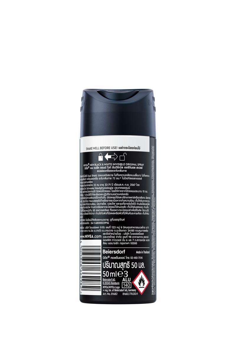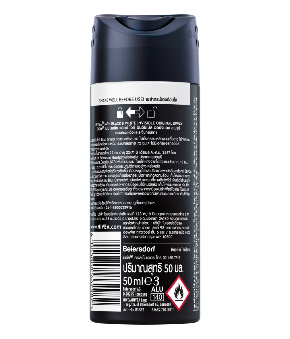 สเปรย์ลดเหงื่อและระงับกลิ่นกาย ด้วยเทคโนโลยี Dual Shield วงแขนแห้งสบาย ไม่ทิ้งคราบเหลืองบนเสื้อขาว ไม่ทิ้งคราบขาวบนเสื้อดำ พร้อมลดเหงื่อ ระงับกลิ่นกาย 72ชั่วโมง+