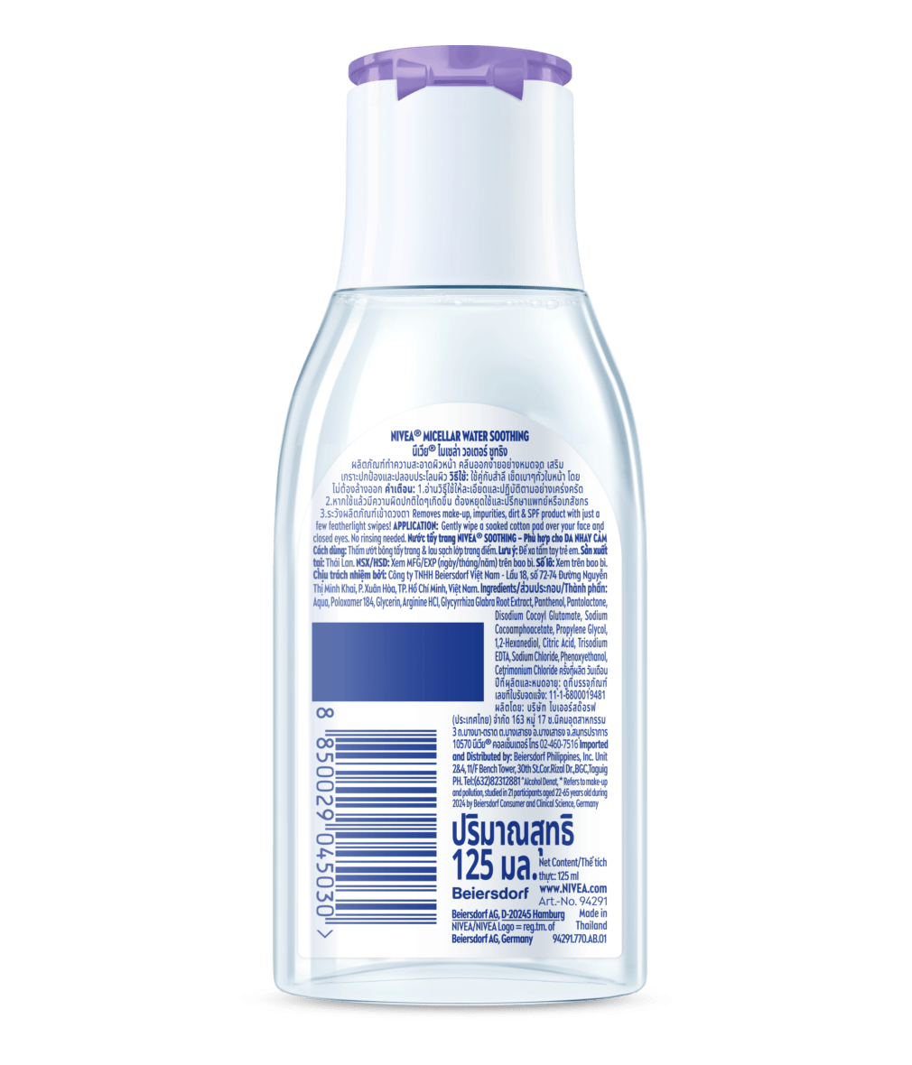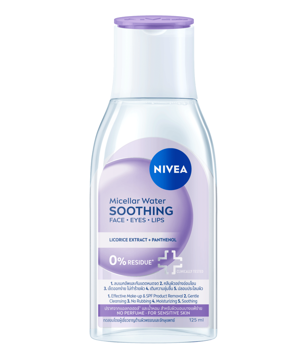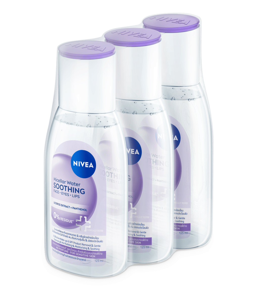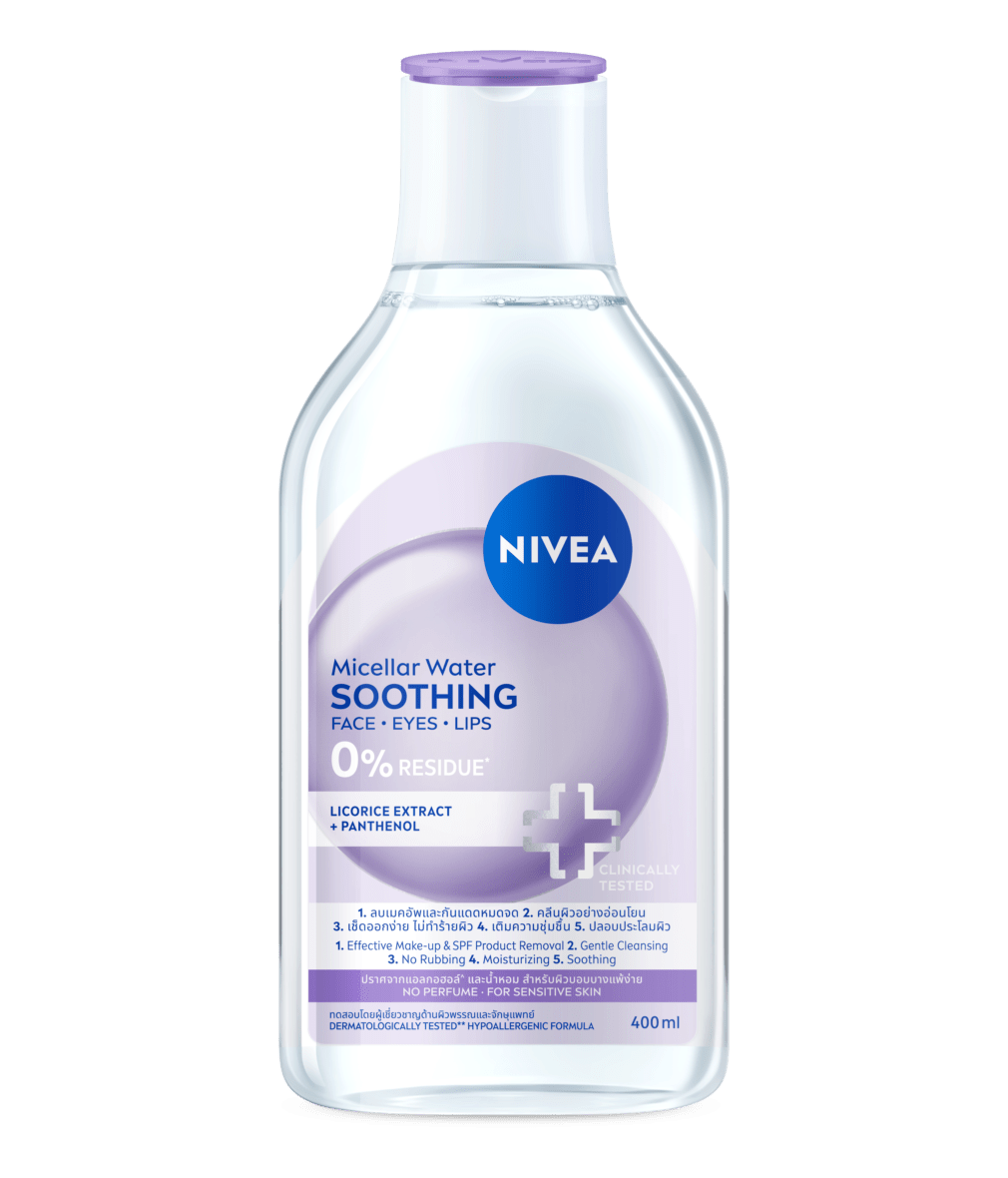 นีเวีย ไมเซล่า วอเตอร์ ซูทธิง ผลิตภัณฑ์ทำความสะอาดผิวหน้า สูตรอ่อนโยนเป็นพิเศษสำหรับผิวบอบบางแพ้ง่าย ผสานสารสกัดลิโคไรซ์ แพนทีนอล และอะมิโน แอซิดคอมเพล็กซ์ คลีนออกง่ายเพียงเช็ดเบาๆด้วยเทคโนโลยีไมเซล่า ลบเมคอัพ สิ่งสกปรก และสารกันแดดอย่างหมดจด พร้อมเสริมเกราะปกป้องผิว ปลอบประโลมพร้อมเติมความชุ่มชื้น.
