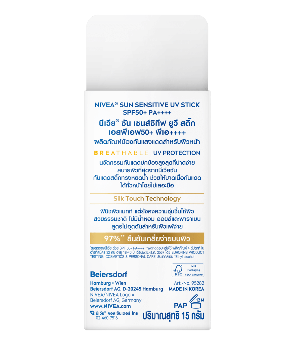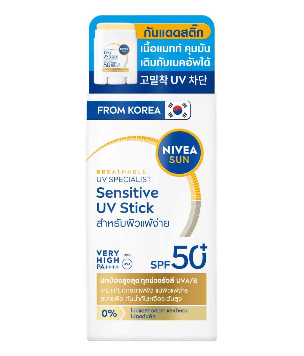 นีเวีย ซัน เซนส์ซิทีฟ ยูวี สติ๊ก เอสพีเอฟ50+ พีเอ++++ ผลิตภัณฑ์ป้องกันแสงแดดสำหรับผิวหน้า กันแดดสติ๊กทรงหยดน้ำ ช่วยให้ปาดกันแดดได้ทั่วหน้าโดยไม่เลอะมือ ฟินิชผิวแมทท์ แต่ยังคงความชุ่มชื้นให้ผิวสวยธรรมชาติ ไม่มีน้ำหอม ออยล์และพาราเบน สูตรไม่อุดตันสำหรับผิวแพ้ง่าย สำหรับพกพากันน้ำกันเหงื่อใช้ได้ทุกวัน